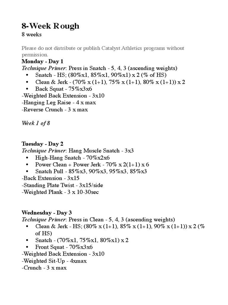 The program consists of week a and week b training cycles, which can be repeated as long as the lifter is making progress. This template is not for those who have no experience in the olympic lifts. Note the full depth, very upright torso, and acute hip and knee angles. Olympic weightlifting program olympic weightlifting is the original strength sport. Workout #3 rbcp strength focused weightlifting program.